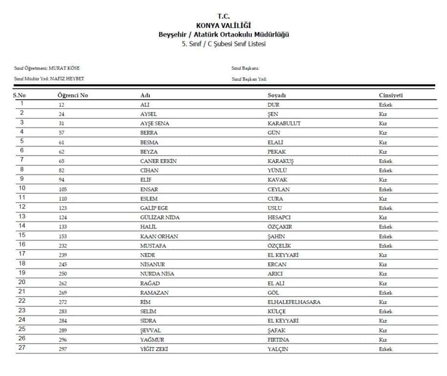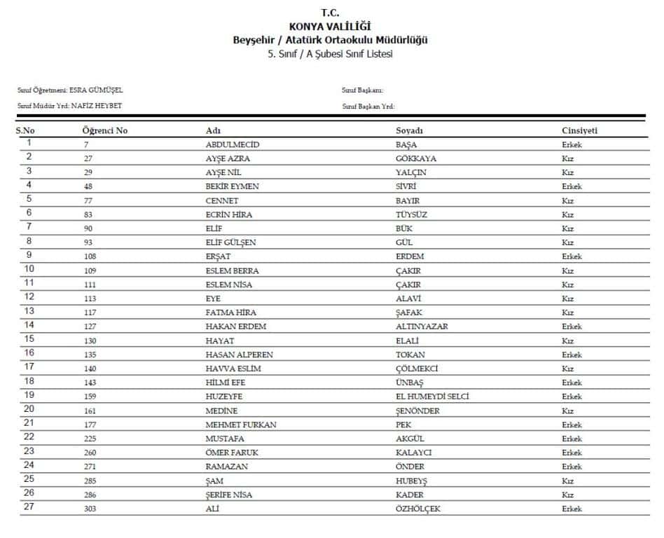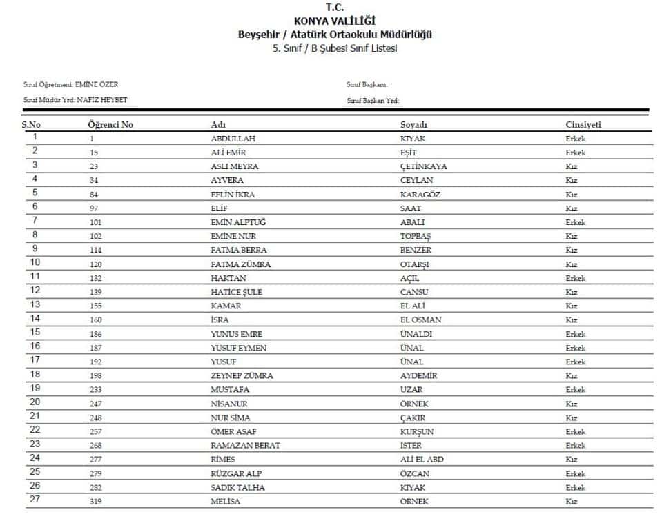 5.sınıf Şube Listeleri